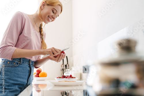 Photo of cheerful woman smiling while cooking breakfast in kitchen