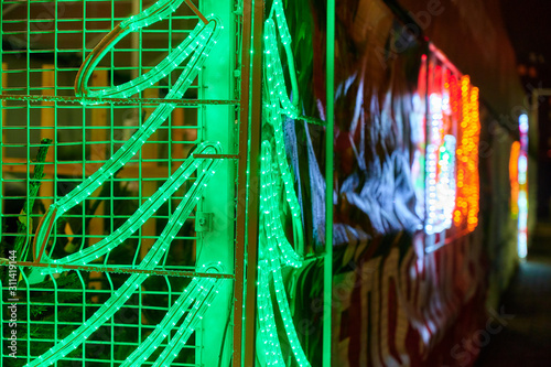 Photo of christmas tree decoration for new year and christmas. Bright lights and colors, festive mood. The concept of a happy meeting of Christmas and New Year.
