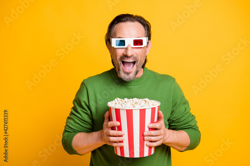 Photo of crazy bristled guy hold paper box popcorn wear 3d glasses green pullover isolated yellow color background