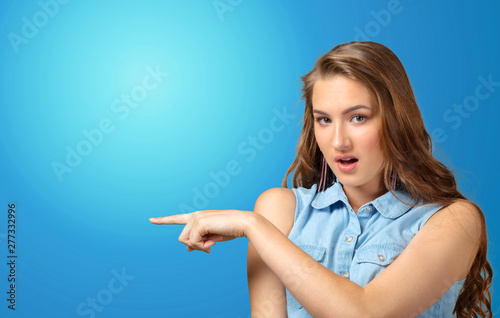 Photo of happy young woman standing, looking at camera showing copyspace pointing