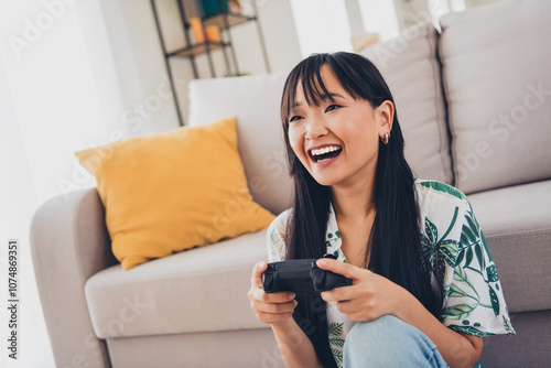 Photo of lovely good mood woman wear t-shirt enjoy weekend play playstation indoors living room apartment