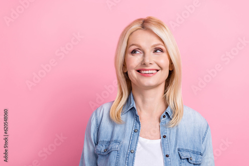Photo of lovely senior blond lady beaming smiling looking side empty space curious wear denim shirt isolated pink color background