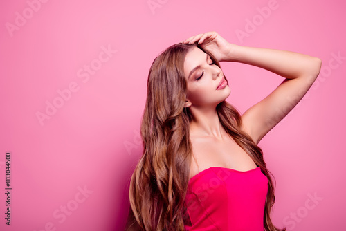 Photo of lovely young girl closed eyes empty space wear dress isolated on pink color background