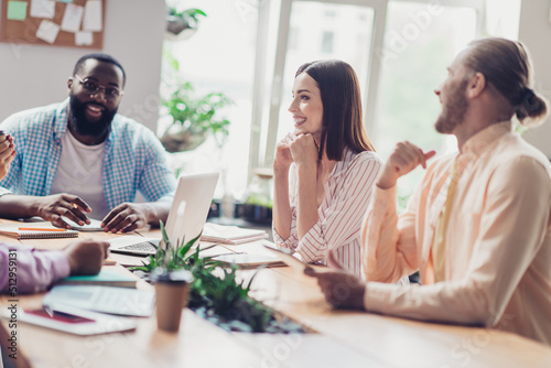 Photo of positive friendly students sitting desktop speak chatting new project business center indoors