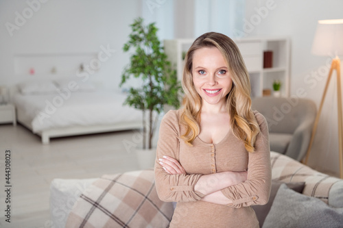 Photo of young attractive cheerful woman happy positive smile confident crossed hands apartment indoors