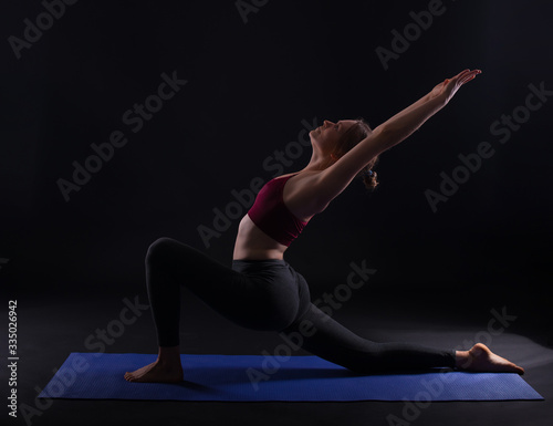 Photo of young sport woman doing yoga on mat over dark background