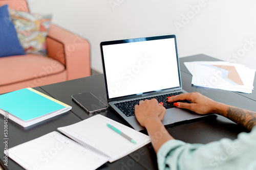 Photo over the shoulder of the woman sitting in front of laptop and looking at blanc empty laptop screen, viewing, texting, using new modern fast communication app, mockup, copy space