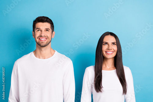 Photo portrait of attractive young male female look up empty space toothy smile wear trendy white garment isolated on blue color background