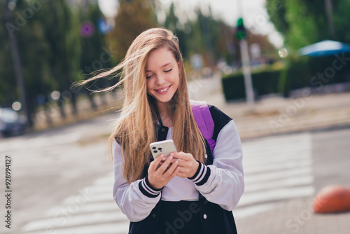 Photo portrait of pretty teen girl hold device influencer dressed stylish uniform outfit walk outside green park background