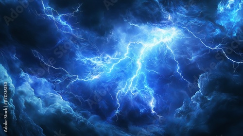 photo realistic of an electric. magic lightning. blue thunder strikes background.