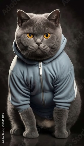 Photo Shoot of Cool, Cute and Adorable Humanoid British Shorthair Cat in Stylish Sportswear:A Unique Athletic Animal in Action with Comfortable Activewear and Gym Clothes like Men, Women, and Kids