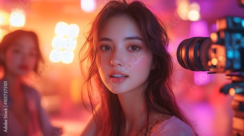 Photographer and crew discussing creative direction on set with Chinese model in a brightly lit studio
