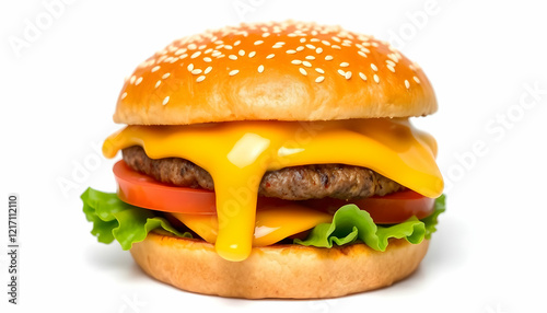 Photorealistic cheeseburger, sesame seed bun, melted cheese, beef patty, lettuce, tomato, high-resolution, studio lighting, food photography, appetizing, vibrant colors, detailed textures, glossy surf
