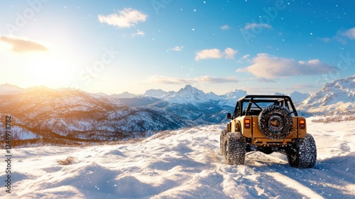 Photorealistic off-road vehicle navigating snowy mountain terrain in stunning detail, showcasing 3-giixel high fidelity in extreme winter conditions.