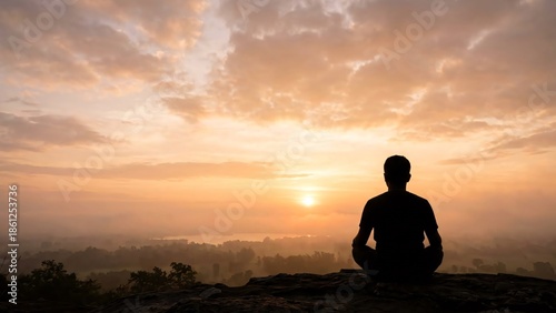 Photorealistic silhouette of a person meditating on a mountain peak at sunrise, embodying peace, spiritual calm, and harmony within nature's breathtaking beauty