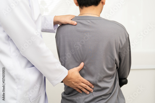 Physical therapy, Asian therapist doctor treat perform pain young man in hospital.