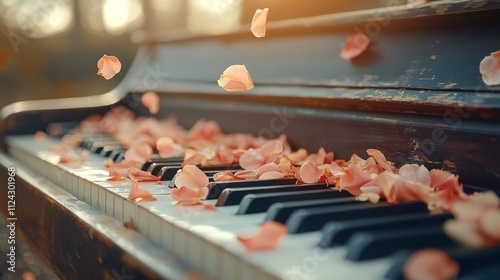 piano; vintage; flowers; white; keys; rustic; music; old; delicate; artistic; nostalgic; decor; close-up; petals; nature; elegant; antique; harmony; romantic; instrument; melody; shabby; wooden; class