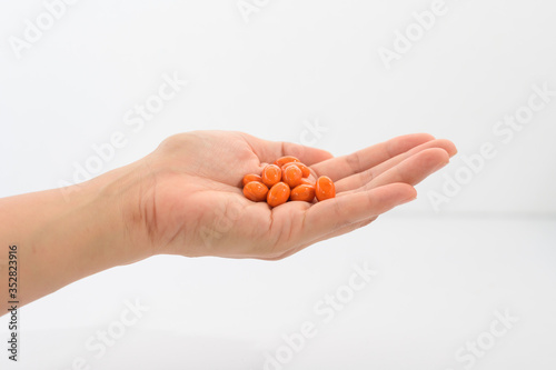 Pick up vitamin capsules to eat