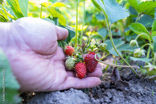 Picking ripe strawberries with hands in the garden