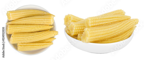 Pickled young baby corn cobs in ceramic bowl isolated on white background Top view. Flat lay