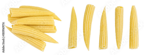 Pickled young baby corn cobs isolated on white background Top view. Flat lay