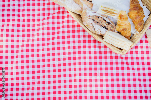 Picnic wicker basket with food, bread, fruit and orange juice on a red and white checked cloth in the field with green nature background. Picnic concept.