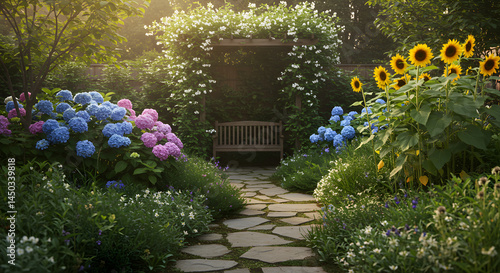 Picturesque Garden Path Leading To A Tranquil Bench Amidst Blooming Flowers