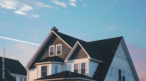 Picturesque house with white siding and black roof against a blue sky