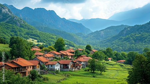 Picturesque Village Nestled in Verdant Mountains