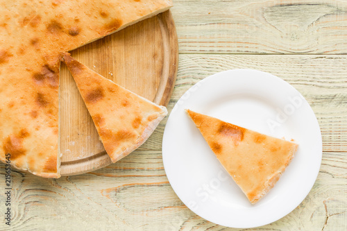 Pie with cheese, khachapuri on a wooden background.