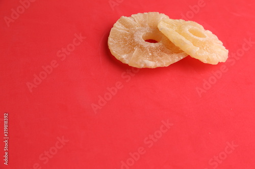 piece of dried pineapple fruit in color background