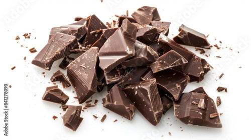 Pieces of broken chocolate on white background. Delicious chunks of dark chocolate waiting to be enjoyed. Perfect for dessert photos, recipe illustrations, or food styling. AI