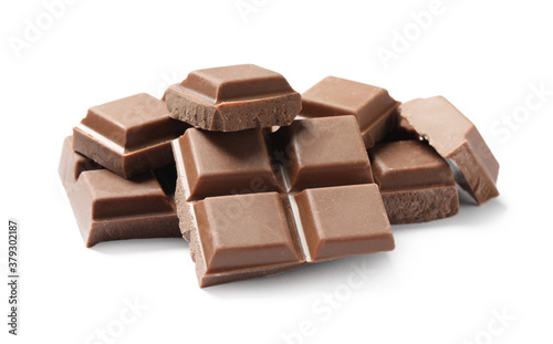Pieces of delicious milk chocolate isolated on white
