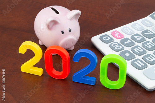 Piggy bank, calculator and numbers 2020 on wooden table, savings in 2020 concept.