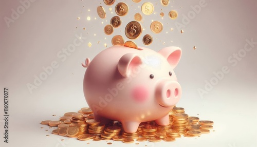 Piggy bank, golden coins falling, savings concept, 3D render, soft lighting, beige background, financial growth, wealth accumulation, ceramic pig, shiny gold, realistic textures, investment theme, min