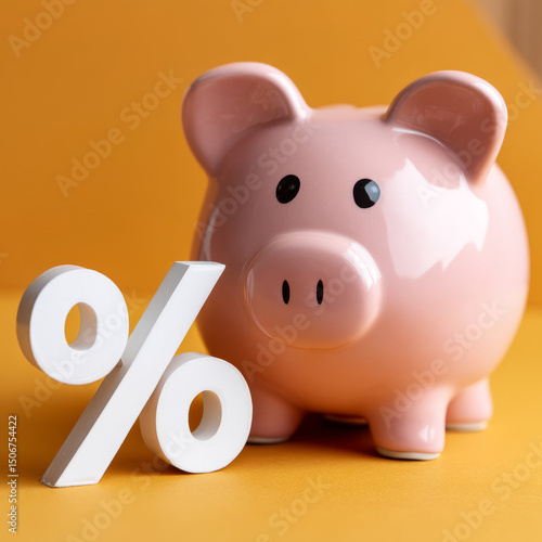 Piggy bank with percentage symbol on orange background.