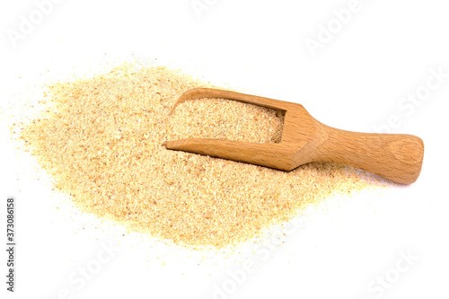 Pile of breadcrumbs and spoon isolated on white