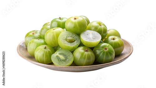 Pile of fresh, green amla or Indian gooseberries on a wooden plate