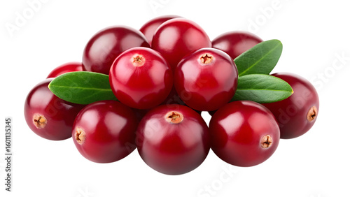 Pile of fresh red cranberries with green leaves isolated on transparent background