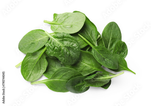 Pile of fresh spinach leaves isolated on white, top view