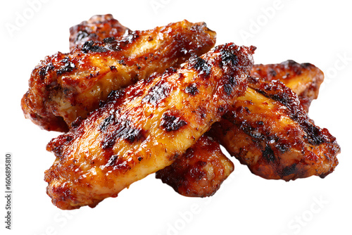 Pile of savory glazed chicken wings covered in sticky barbecue sauce is isolated on a transparent background for restaurant takeout menu