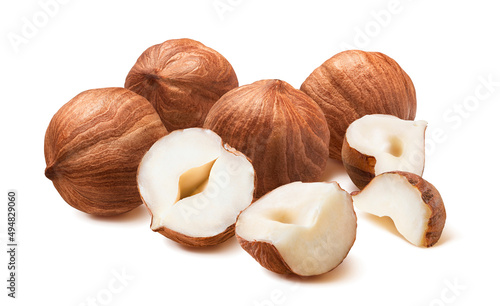 Pile of shelled hazelnuts isolated on white background