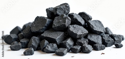 Pile of shiny black coal pieces isolated on white background. Natural carbon mineral stone material resource for fossil fuel power industry and dark ember heat production.