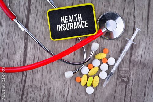 Pills, Syringe and Stethoscope with text Health Insurance