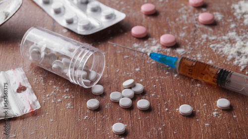 Pills, syringes and powder on wooden table, closeup. Hard drugs