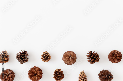 Pine cones on a white table. Flat lay with blank copy space.