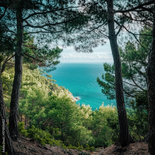pine forest with the sea just beyond the trees. The bright green of the pine needles contrasts with the calm blue of the ocean