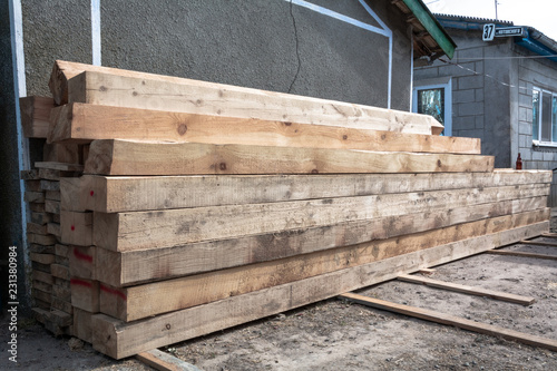 Pine wood timber stack of natural rough wooden boards on building site. Industrial timber building materials for carpentry, building, repairing and furniture, lumber material for roofing construction.