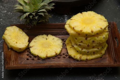 Pineapple juicy yellow slices wooden background. Top view. Pineapple fruit cut on wooden. Chopped pineapple salad in half pineapple. Fresh delicious cut into pieces. Tasty summer fruit.
