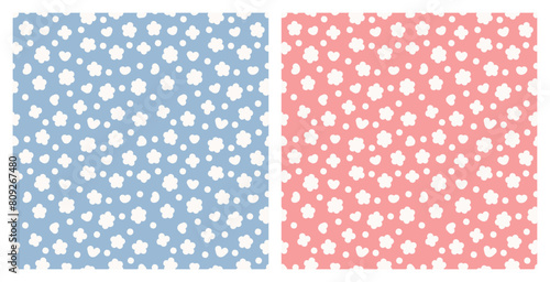 Pink and Blue Dots Patterns Vector Set. Seamless Baby Backgrounds with Clouds, Flowers, Hearts and Dots. Childish Print. Vector illustration.